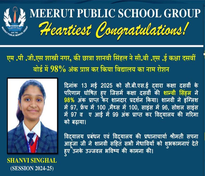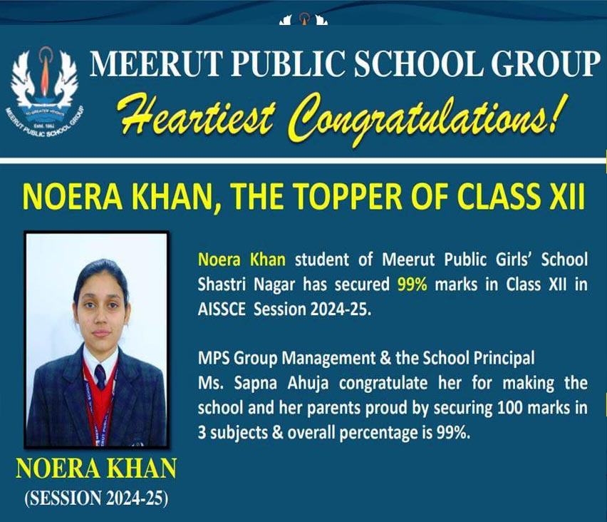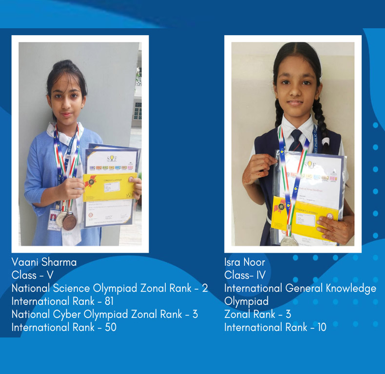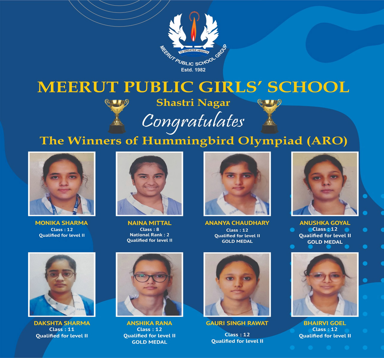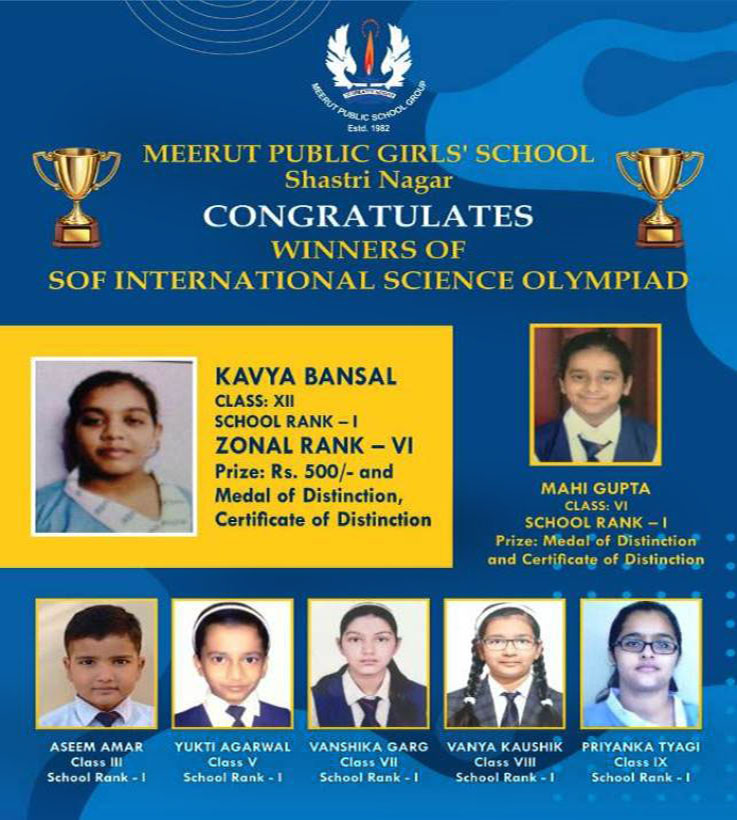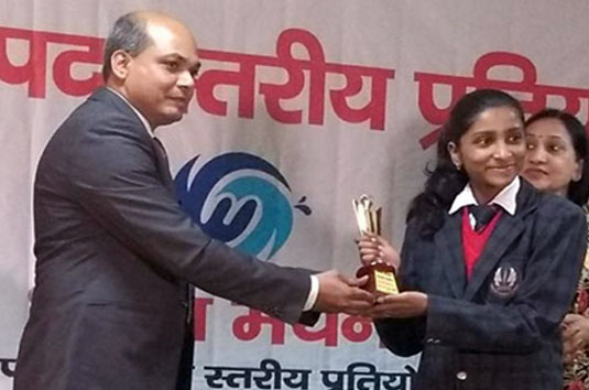 Mahak Gupta of XI A was declared the District Topper in Hindustan Olympiad for class 11 conducted by Hindustan Group. She was felicitated with a gold medal, cash prize of 2100/- along with a certificate.