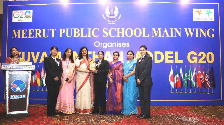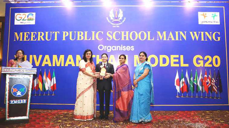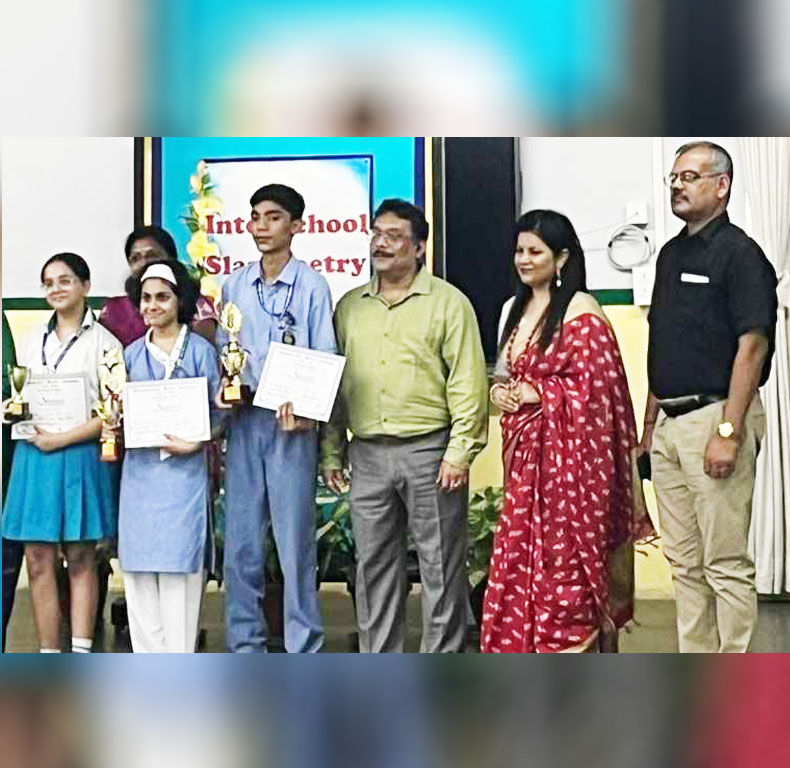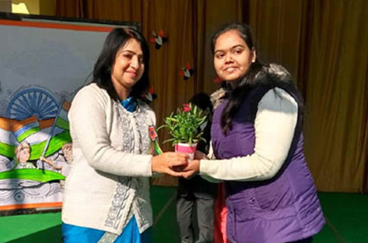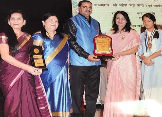 Khushi Patwal and teacher Ms. Nupur Sharma were felicitated with Gyan Kunj Award and Bhasha Sarthi Award respectively by Hindi Vikas Manch at Air Force Auditorium, Subroto Park, Delhi.