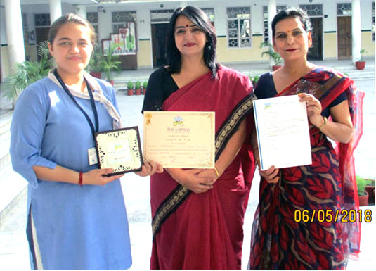 Akshita Aggarwal of 11 A brought laurel to the school winning the first position in Painting Competition on the topic 'Not to Burn the Remains of Crops' organized at Tahsil level by Agriculture Department U.P. on 1 October 2018.